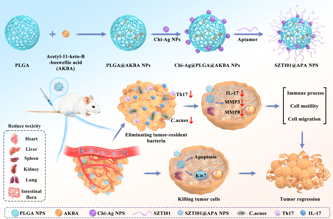 针对以上问题,基于前期周青教授采用西黄丸“活血解毒”功效治疗前列腺癌的中医理论依据,结合前列腺癌肿瘤内细菌研究前沿领域,充分分析“活血解毒”科学内涵,筛选西黄丸发挥抗肿瘤及抗菌功效的关键核心化合物3-乙酰基-11-酮-β-乳香酸。并采用乳化-溶剂挥发法与静电吸附法构建了一种适配体靶向递送系统SZTI01@APA NPs,用于输送3-乙酰基-11-酮-β-乳香酸与壳聚糖-银。研究通过2bRad-M测序技术对临床前列腺癌样本与正常前列腺组织中的肿瘤内微生物群进行了分析,揭示了二者在微生物群丰富度上的差异。进一步阐明了SZTI01@APA NPs对前列腺癌发挥治疗作用的机制,并揭示了其作为纳米复合材料的肿瘤靶向性,为在前列腺癌肿瘤内微生物群背景下联合化疗与抗菌治疗提供了一种新策略。