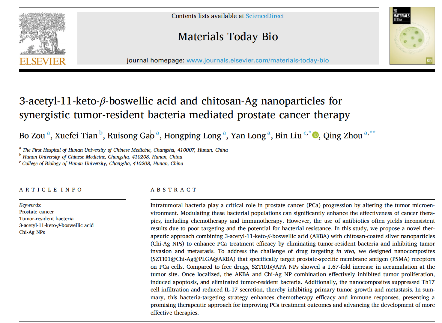 近日,我校第一附属医院周青教授团队在国际著名期刊《Materials Today Bio》(中国科学院1区,IF:10.2)发表题为“3-acetyl-11-keto-β-boswellic acid and chitosan-Ag nanoparticles for synergistic tumor-resident bacteria mediated prostate cancer therapy”的最新研究成果。该研究源自国家自然科学基金区域创新发展联合基金重点支持项目及国家自然科学基金面上项目。项目以周青教授团队西黄丸“活血解毒”治疗前列腺癌为理论依据,通过筛选西黄丸抗肿瘤活性成分,创新性地提出一种基于西黄丸活性成分3-乙酰基-11-酮-β-乳香酸的靶向纳米策略,该策略有效地提高药物的体内生物利用度并降低药物主要脏器毒性。同时,为解决体内药物靶向的难题,设计了能特异性靶向前列腺特异性膜抗原受体的纳米复合材料,赋予药物高度的靶向和渗透能力。这一成果不仅揭示了清除肿瘤内细菌并抗肿瘤的协同靶点来提高前列腺癌的治疗效果,同样对中医药理论及方药的现代化研究提供了实验参考依据。
