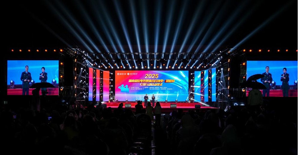 为进一步强化校园反电诈禁毒工作,提升广大师生反电诈防骗和禁毒意识,11月1日,2025年湖南省反电诈禁毒百日攻坚·进校园专项行动在我校正式启动。省公安厅副厅长车丽华,省委教育工委委员、省教育厅党组成员余伟良,团省委二级巡视员邓资益,中国人民银行湖南省分行副行长谢汉阳,省通信管理局副局长王大顺,省戒毒管理局副局长黄勇,省公安厅刑事侦查总队政委陈东明,省公安厅禁毒总队政委易勇,省委网信办相关负责人等嘉宾,与我校党委书记戴爱国、校长易刚强、党委副书记汤文胜,副校长张玉芬、廖菁、刘红华出席启动仪式,驻长47所高校相关负责人、全省公安系统民警代表、学校教师代表及新生代表共计4500余人参加启动仪式。