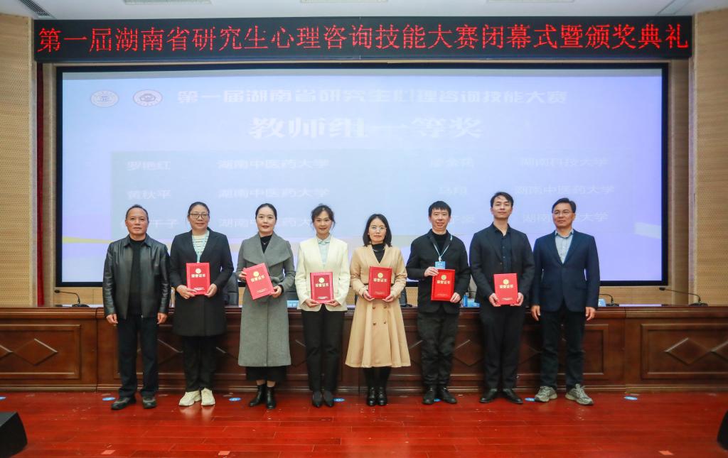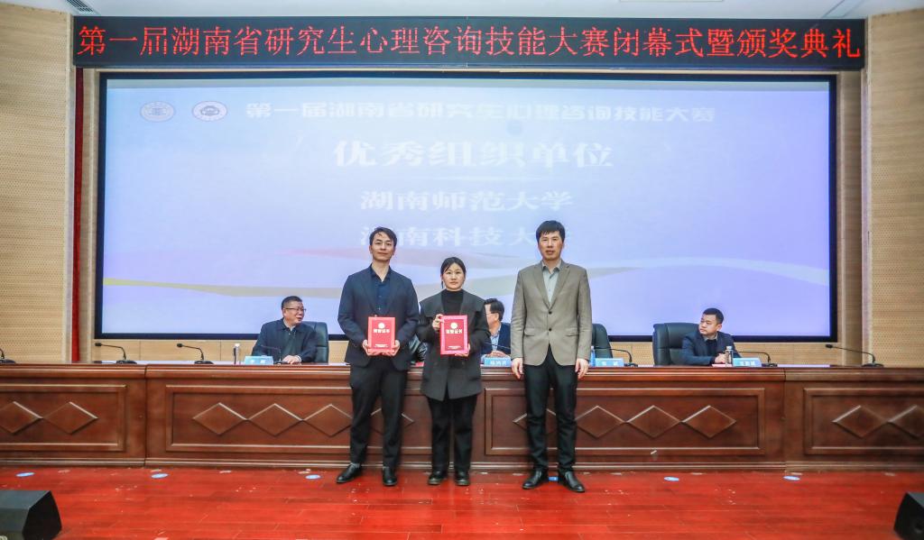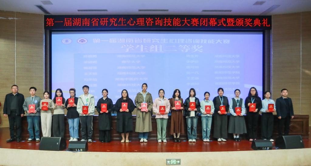 11月15日,由湖南省教育厅主办、我校承办、湖南省社会科学普及项目支持的第一届湖南省研究生心理咨询技能大赛在济世楼学术报告厅圆满落幕。湖南省教育厅学位管理与研究生教育处二级调研员刘梦清,我校纪委书记、省纪委省监委驻学校纪检监察组组长陈鸿君出席颁奖典礼。