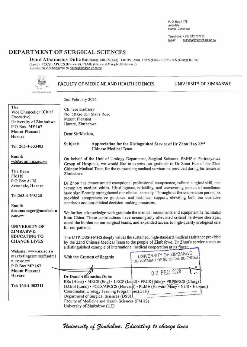 热点要闻中国驻津巴布韦大使馆收信 致谢我校援津医生周浩