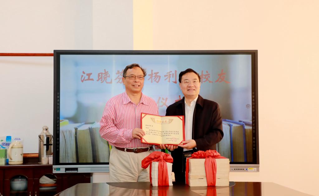 秦裕辉为两位校友颁发了捐赠证书。捐书仪式结束后,与会领导和专家继续就合作事项与两位校友进行了座谈。