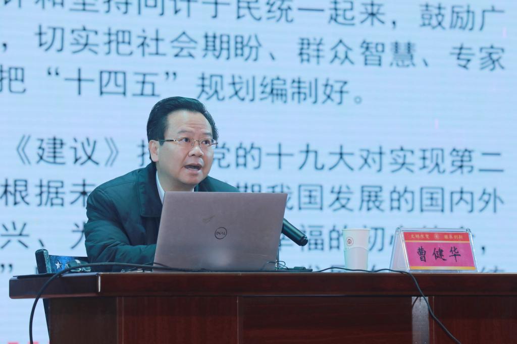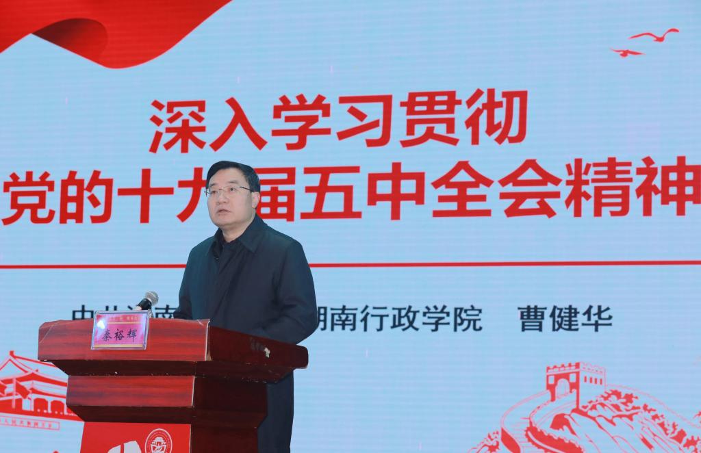 曹健华以《深入学习贯彻党的十九届五中全会精神》为题,紧紧围绕习近平总书记在党的十九届五中全会上的重要讲话精神和全会审议通过的规划《建议》,紧密联系以习近平同志为核心的党中央团结带领全党全国各族人民走过的伟大历程和取得的举世瞩目成就,深入宣讲中国特色社会主义制度的优势和强大生命力,全面解读和深入阐释二〇三五年远景目标和“十四五”时期我国发展的指导方针、主要目标、重点任务,并密切结合习近平总书记考察湖南重要讲话精神和湖南省“十四五”规划《建议》,进行了系统解读。
