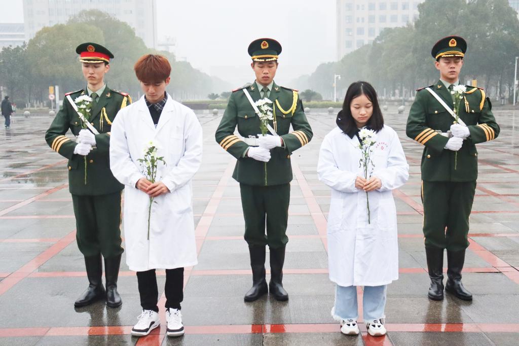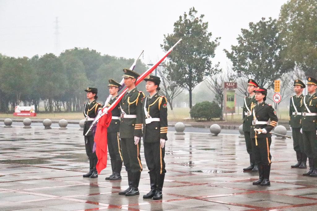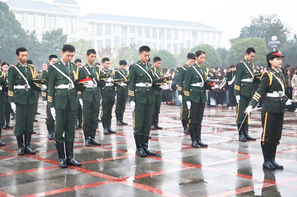 清晨7点,淡日朦胧,天色初破晓,主持人宣布仪式正式开始。国旗仪仗队迎着小雨,踏着坚定的步伐将国旗、校旗护送到升旗台前。随后,国旗、校旗在昂扬的国歌声和校歌声中缓缓升起,全体肃立,行注目礼。礼毕,警报拉响,鸣笛声传遍校园,国旗与校旗降半旗,全场肃穆追悼。