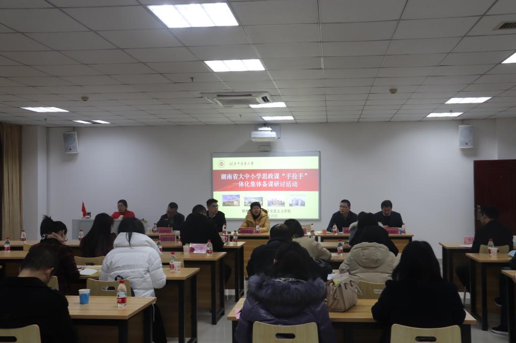 1月25日上午,省大中小学思政课“手拉手”一体化集体备课启动仪式暨第一次线下集体备课研讨会在我校召开。会议旨在深入学习贯彻习近平总书记在学校思想政治理论课教师座谈会上的重要讲话精神、推动习近平新时代中国特色社会主义思想进教材进课堂进学生头脑,大力推进我省大中小学思政课一体化建设,切实提升学校思政课教学质量。校(院)纪委书记张玉芬、长沙市教育局宣传统战处处长黄军山、长沙市教科院规划所所长袁苍松及各合作院校领导、教师代表50余人出席会议。会议由马克思主义学院院长叶利军主持。