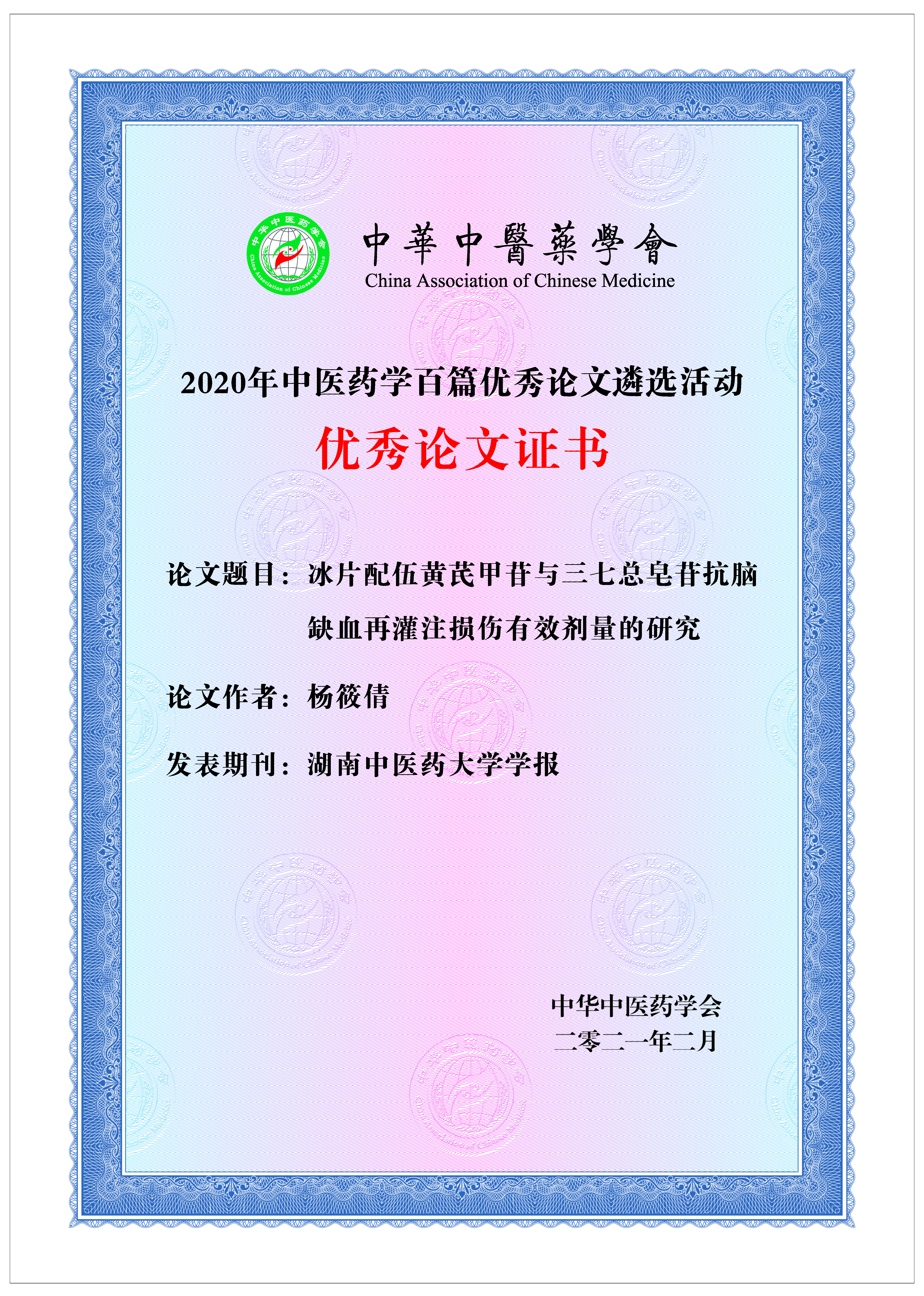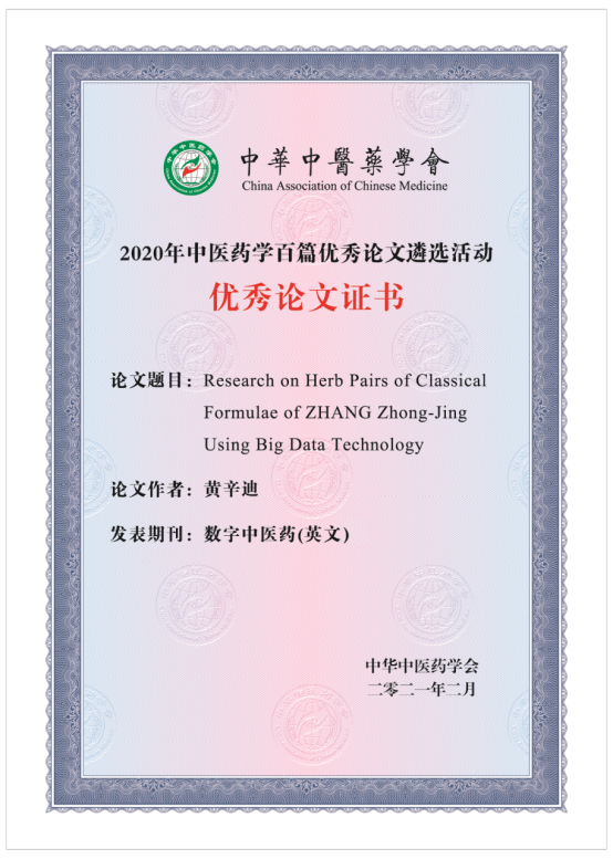 经期刊自荐、专家推荐,评审专家组评选,《学报》参选的《冰片配伍黄芪甲苷与三七总皂苷抗脑缺血再灌注损伤有效剂量的研究》(作者杨筱倩)和DCM参选的《Research on Herb Pairs of Classical Formulae of ZHANG Zhong-Jing Using Big Data Technology》两篇论文入选2020年度中医药学百篇优秀论文。