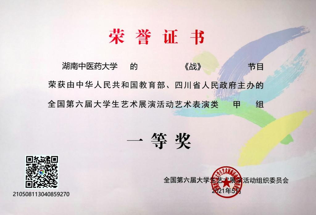 5月6日至13日,全国第六届大学生艺术展演活动在四川成都举行。学校原创朗诵节目《战》参加现场展演,荣获本届展演最高奖项:艺术表演类甲组一等奖,这是学校参加大学生艺术展演以来获得的最佳成绩。展演当天,湖南省教育厅二级巡视员左清看望慰问我校参演师生,并对我校入选的朗诵节目给予了高度肯定。