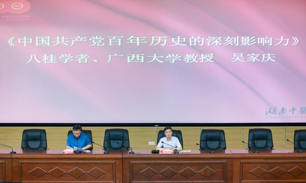 广西大学八桂学者吴家庆教授作题为《中国共产党百年历史的深刻影响》讲座,深刻解读了对新时代发展阶段的认识,对百年未有之大变局的认识;湘潭大学-李佑新教授作题为《如何研究和认识中共党史》讲座,提出要树立正确的党史观,要坚持用唯物史观来认识历史,要坚持实事求是的思想路线,分清主流和支流,坚持真理,修正错误,发扬经验,吸取教训。