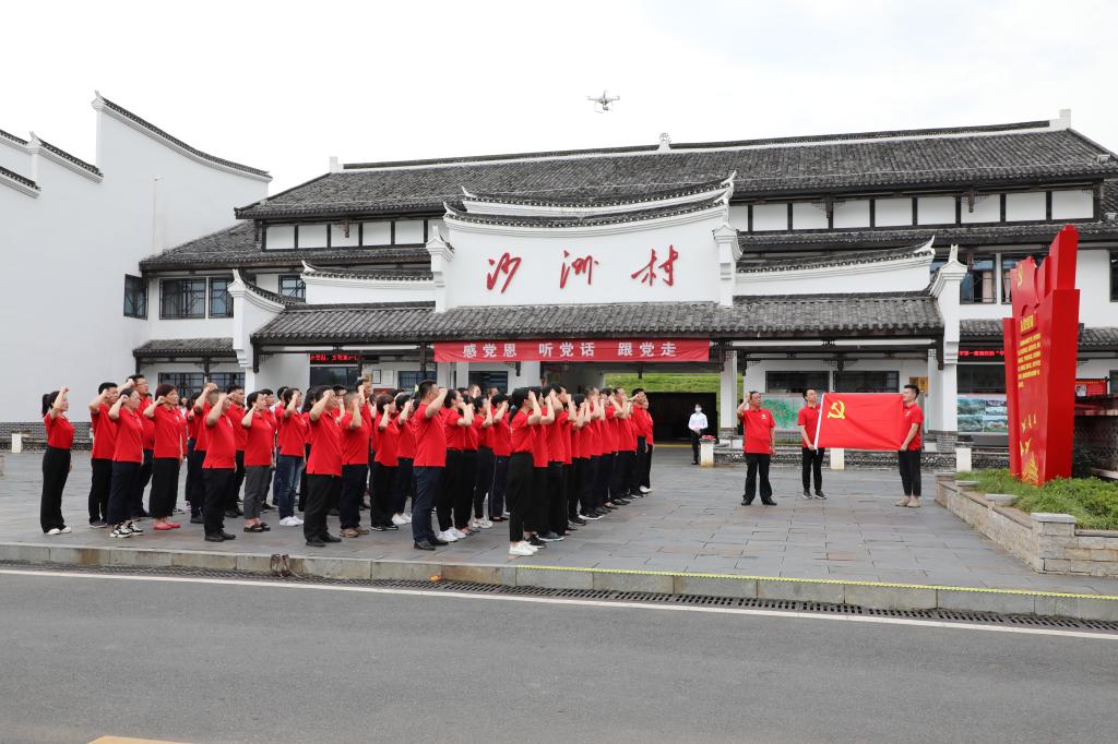 学习组一行首先来到汝城县沙洲村。循着红色足迹,全体党员在沙洲村广场的中国共产党党旗雕塑前,怀着崇敬的心情整齐肃立,医院院长陈新宇带领大家重温入党誓词,铿锵响亮的誓词回荡上空,全体党员初心澎湃,信念坚定。