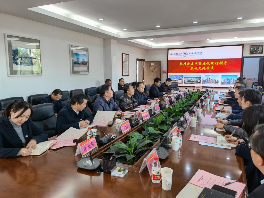 12月2日下午,中国建设银行总行机构部副总经理黄小汉、中国建设银行湖南省分行副行长文志军一行来我校调研交流。双方在行政楼二楼会议室召开银校合作座谈会。校(院)党委书记秦裕辉,校(院)长戴爱国,副校长廖菁,党政办公室、财务处、保卫处、教务处、网络安全与信息化中心等相关单位负责人参加会议,会议由廖菁主持。
