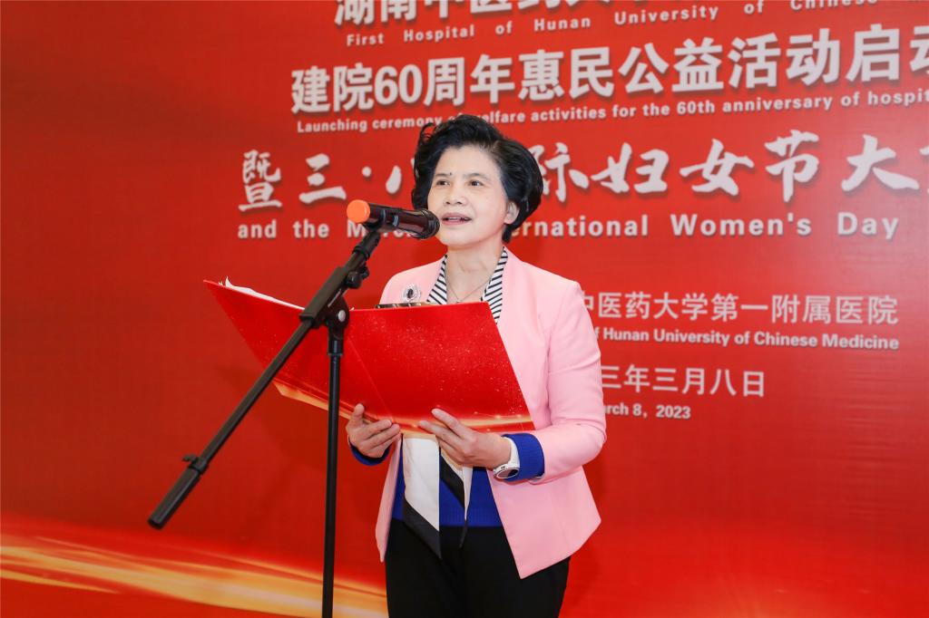 易刚强向医院建院60周年惠民公益活动专家代表、全国名中医、全国三八红旗手尤昭玲教授授旗。尤昭玲表示,作为医院建院60周年惠民公益活动义诊专家团队中的一员,深感责任艰巨、意义重大,将率领中医生殖团队,发扬踏实肯干的精神,让老百姓享受到优质中医药服务,为健康湖南、健康中国建设贡献力量。