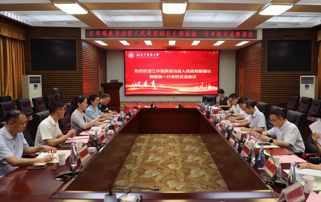 廖菁对熊丽丽一行来访表示热烈欢迎,并介绍了我校基本情况及办学成果。他指出,学校将围绕江华瑶族自治县经济社会发展需求,充分发挥学科、人才、科研优势,积极推动双方在医疗服务、科研创新、人才供给和产业发展等方面的合作,实现双方互利共赢、优势互补、合作共进,共同为中医药强省和健康湖南建设作出新的更大贡献。