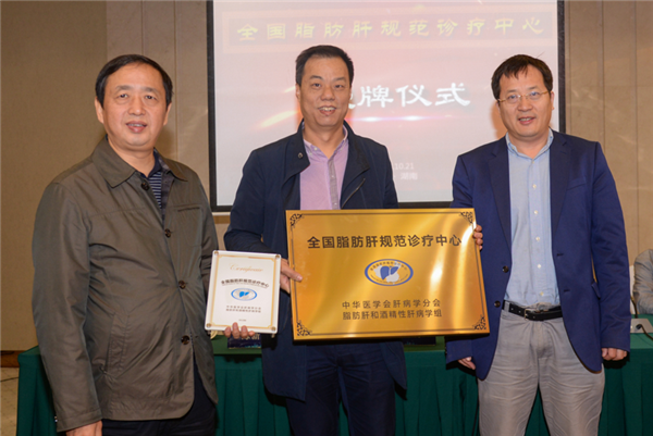 10月21日上午,“全国脂肪肝规范诊疗中心”授牌仪式在长沙举办。中华医学会肝病学分会授于我校第一附属医院“全国脂肪肝规范诊疗中心”,同时成立了湖南省中西医结合脂肪肝和酒精性肝病学组,并举办了该学组第一次学术会议。