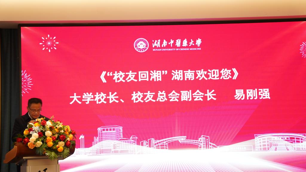 易刚强向校友们介绍了学校“校友回湘”工作的方案与举措,紧紧围绕“校友+人才返湘、校友+科技兴湘、校友+项目聚湘、校友+企业来湘、校友+教育强湘”五大核心,盛情邀约全球校友,共同奋斗续写崭新篇章。