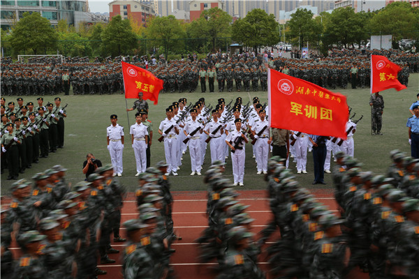 武警湖南总队、机动支队参谋黄文波少校代表帮训方感谢学校领导、老师的鼎力支持和同学们的充分信任,他希望全体新生把这次军训成果转化为努力学习、刻苦钻研的强大精神动力;教师代表信息科学与工程学院刘伟以“自信、自律和自爱”与全体新生共勉,希望新生们珍惜时光,不负韶华;新生代表信息科学与工程学院的梁森表示愿以奋斗者的姿态努力学习,发奋拼搏,担当起国家民族复兴之大任。