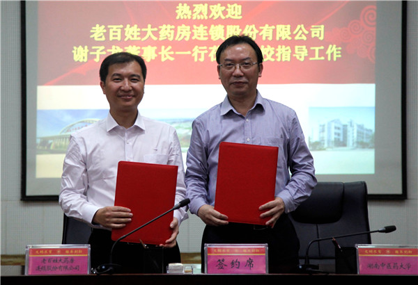 何清湖、余勇分别代表湖南中医药大学、老百姓大药房连锁股份有限公司共同签署《战略合作框架协议书》。