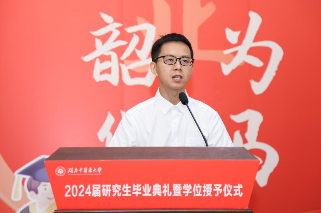 毕业生代表、中西医结合基础硕士研究生罗荣司庆同学回顾了在校学习与生活的点滴,由衷地感谢母校的培养及恩师的指引,她表示将继续以校训为指引、把“小我”的实践融入时代的“大潮”,为国家现代化建设和民族伟大复兴贡献自己的青春力量!