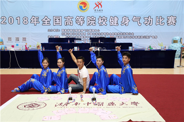 我校传统保健队是由体育艺术学院院长罗华为领队、龙专老师为教练、2014级中西结合学院钟良、2015级人文与管理学院门超利、2015级针灸推拿学院曾源源、2017级针灸推拿学院杨珊珊4位同学组成。经过长期精心准备、暑期无休、赛场上的顽强拼搏,最终斩获:五禽戏集体竞赛第一名(一等奖)、六字诀集体竞赛第四名(二等奖)、门超利获易筋经个人赛金牌、曾源源获五禽戏个人赛铜牌、杨珊珊获六字诀个人赛铜牌、钟良获八段锦个人赛第四名;尤其杨珊珊同学到达赛地后因南北气候差异而导致水土不服,上午医院打点滴,下午上赛场,奋力拼搏勇夺佳绩、精神可嘉!