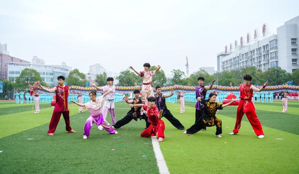 开幕式文体表演环节,精彩纷呈,青春飞扬。《龙武鼓韵》率先登场,医学院320名学子联袂舞龙、传保与武术队,刚柔并济,气势撼人。舞龙队携三色长龙翻腾起舞,如云如浪;武术队拳脚生风,动静皆显英姿。