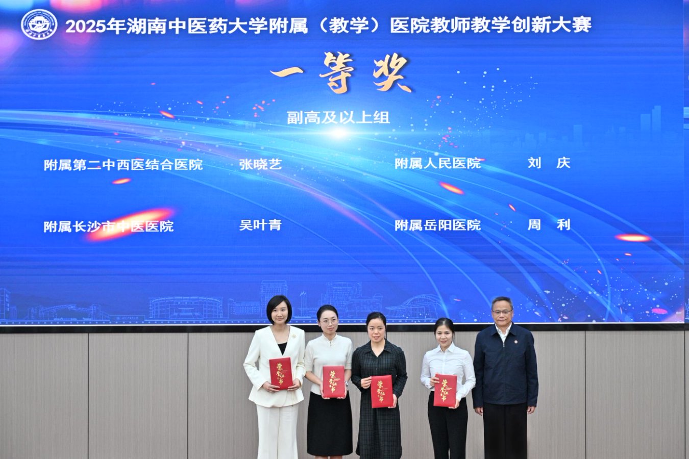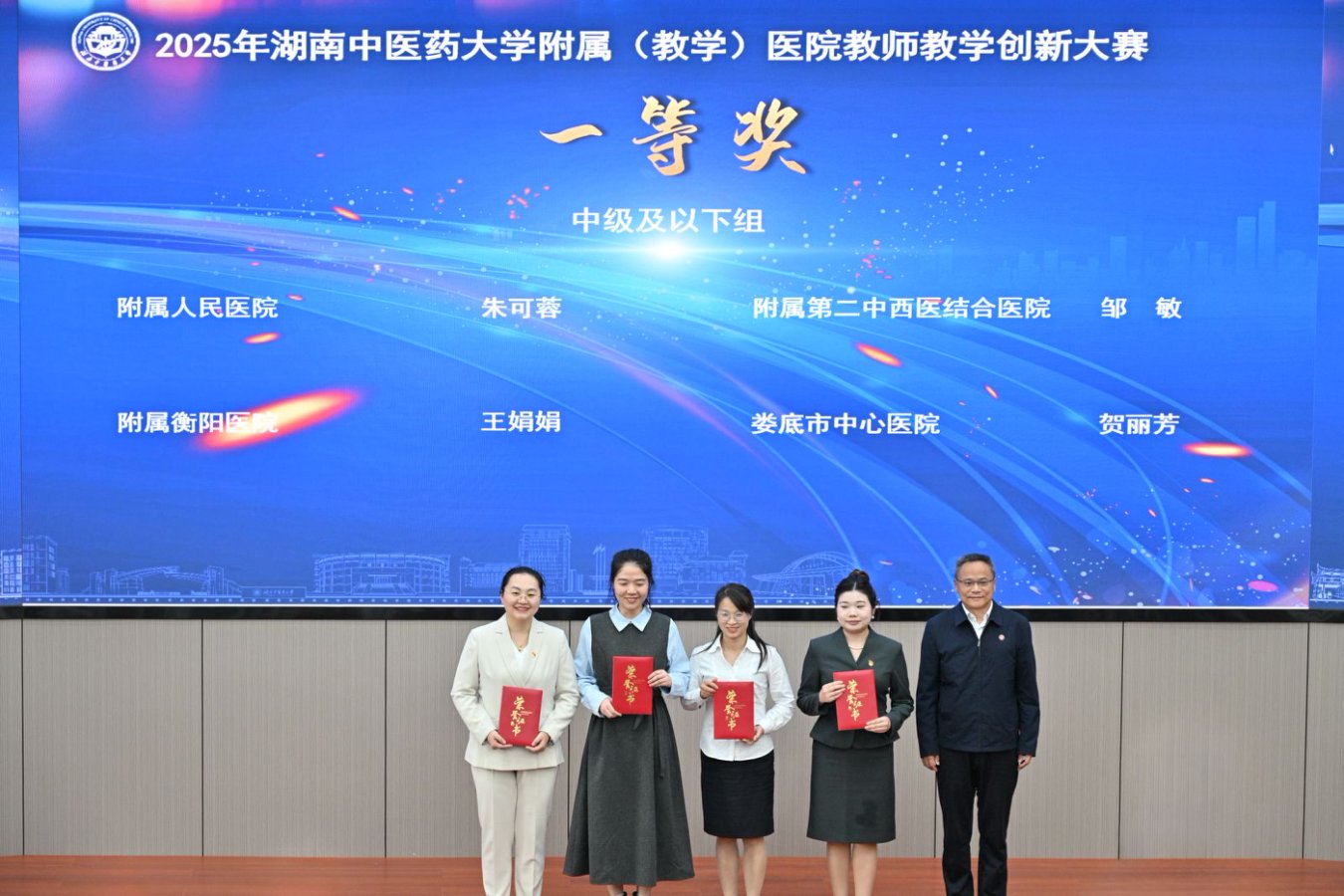 来自17家附属(教学)医院的34支教学团队分为副高及以上和中级及以下两组同场竞技,根据参赛教师前期评审和现场展示两个环节的成绩,大赛综合评定出参赛教师最终获奖等级。经过激烈角逐,大赛最终评选出一等奖8项、二等奖12项、三等奖14项。其中,附属第二中西医结合医院张晓艺团队、附属人民医院刘庆团队、附属长沙市中医医院吴叶青团队、附属岳阳医院周利团队荣获副高及以上组一等奖;附属人民医院朱可蓉、附属第二中西医结合医院邹敏团队、附属衡阳医院王娟娟团队、娄底市中心医院贺丽芳团队荣获中级及以下组一等奖。