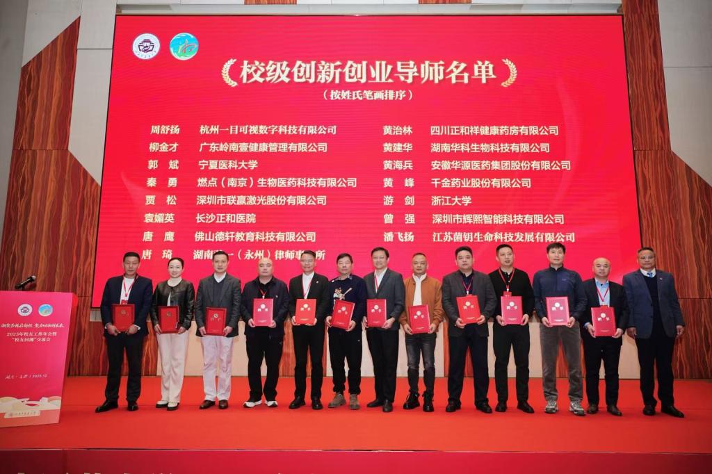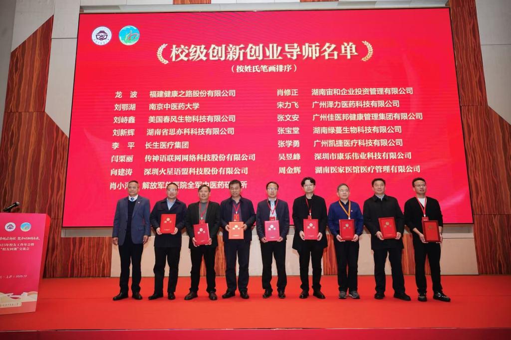 在表彰与聘任环节,副校长、校友总会副会长刘鸿翔宣读了《关于授予湖南中医药大学2025年度“优秀校友分会”“优秀校友工作者”荣誉称号的决定》和《关于聘请龙波等30名同志为校级创新创业导师的通知》。