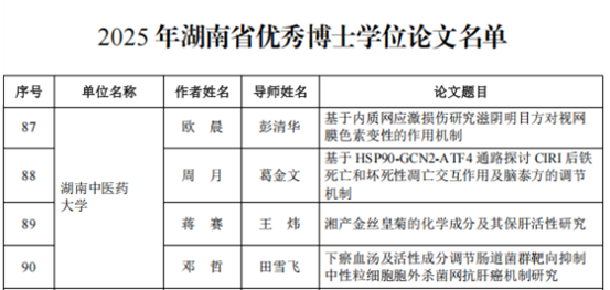 近期,2025年度湖南省优秀博士学位论文评选结果正式公布,我校在中医学、中药学和中西医结合主干学科领域成绩斐然,共有4篇博士学位论文获评“湖南省优秀博士学位论文”。此次获奖篇数创学校历史新高,标志着我校研究生培养质量实现了新的跨越。