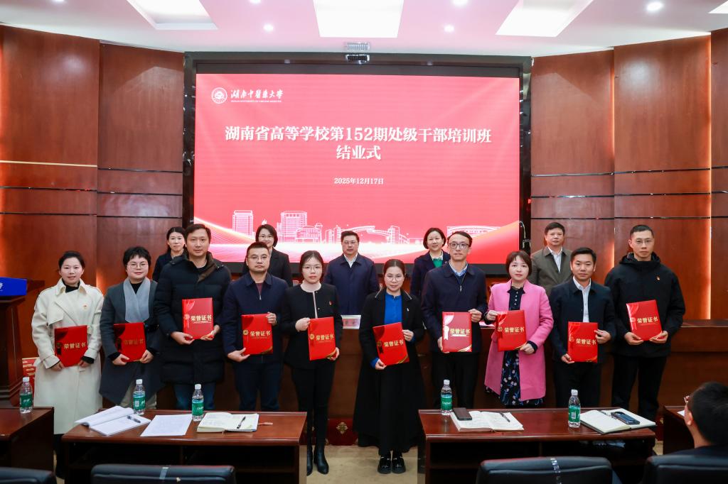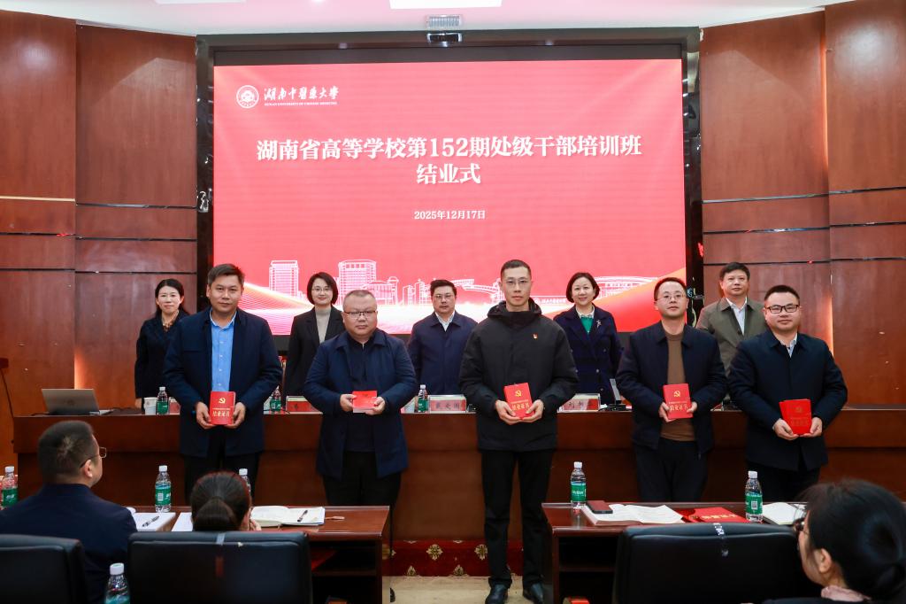 12月17日上午,湖南省高等学校第152期处级干部培训班结业式在我校国际交流中心学术报告厅举行。校党委书记戴爱国,省委教育工委组织部部长刘书华,湖南省高校干部培训中心主任、书记冯臻出席结业式。学校党委副书记、党校校长汤文胜主持会议。