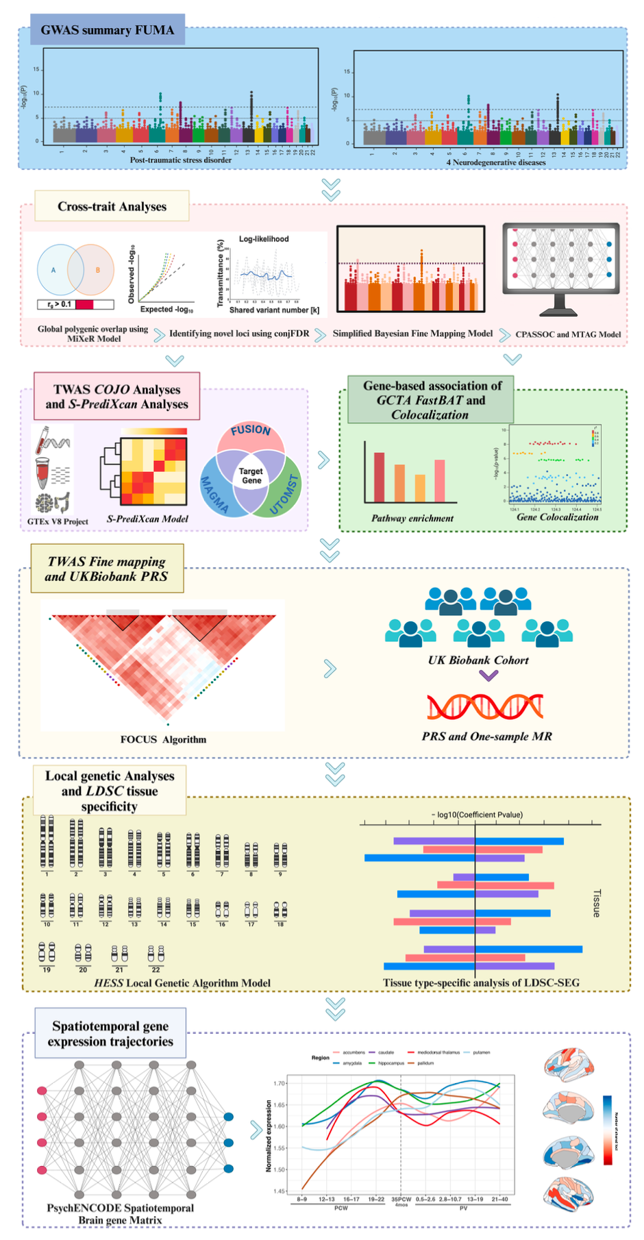 研究旨在从全基因组层面系统回答两个关键科学问题:一是创伤后应激障碍(PTSD)与四种神经退行性疾病(阿尔茨海默病、帕金森病、肌萎缩侧索硬化症、多发性硬化)在遗传变异上共享多少资源;二是这些共享变异富集于哪些分子通路与脑区发育轨迹,从而揭示潜在的多疾病交汇节点与治疗靶标。