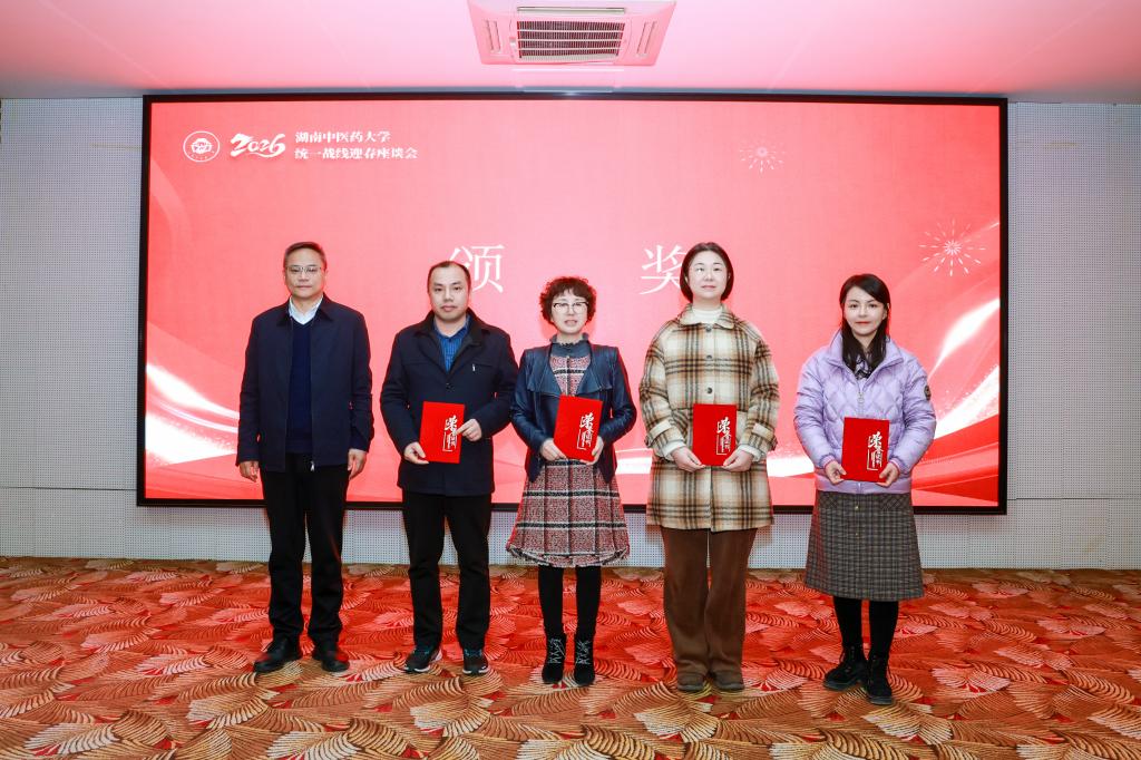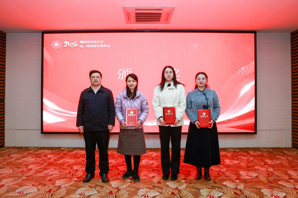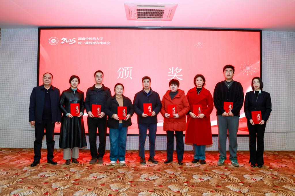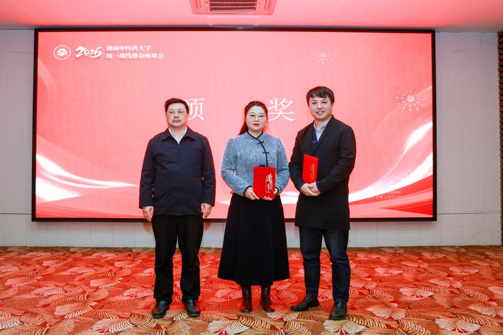 戴爱国、易刚强、刘鸿翔为第五届湖南中医药大学“党委出题 党外调研”优秀成果获奖代表和受表彰集体颁发证书。