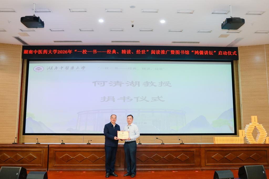 仪式现场,何清湖向学校图书馆捐赠《中华传世医书》,并开启第14期“名家名师讲堂”暨图书馆“鸿儒讲坛”首期讲座,以“读书,教书,写书”为题分享治学心得,为师生带来一场兼具思想深度与文化温度的思想盛宴。