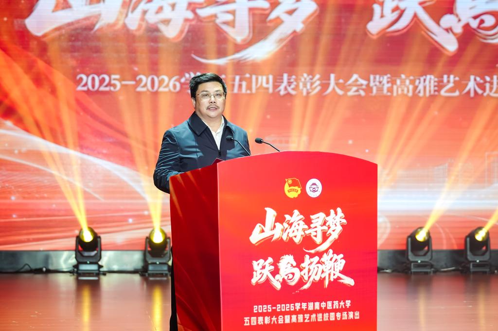戴爱国代表学校党委向全校广大青年朋友们致以节日的问候,向获得表彰的先进集体和个人表示热烈祝贺。他指出,过去的一学年里,学校党委坚持以党建带团建,深耕育人、厚植沃土,让青年成长更有力量。从三部委高雅艺术进校园项目的首次落地,到“挑战杯”竞赛的历史性突破;从西部计划参与志愿者人数再创新高,到多项荣誉实现“零的突破”,湖中大学子用拼搏赢得了无上荣光。他寄语全校青年要锚定历史方位,在“薪火相传”中坚定“强国有我”的信念,让青春信仰愈发坚定,让五四精神永葆锋芒;要校准时代方位,在“敢闯敢试”中淬炼“勇立潮头”的锋芒,在中医药现代化、科技强国建设的时代征程中勇立潮头、勇攀高峰;要把握实践方位,在“扎根大地”中厚植“人民至上”的情怀,把论文写在祖国大地上,把医术用在守护人民健康上,把青春融进民族复兴的洪流中。