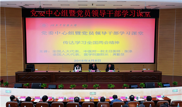4月8日,党委中心组暨党员领导干部学习课堂在三号教学楼学术报告厅举行,主题传达学习 “两会”精神。全国人大代表张涤、庹勤慧传达了十三届全国人大一次会议精神。全体在家校(院)领导、校(院)及直属附属医院全体处以上干部、校(院)教职工党支部书记、三所直属附属医院职工党支部书记、机关科以上干部、各民主党派主委、党外知识分子联谊会负责人及学生党支部书记、部分学生代表参加学习。校(院)党委书记秦裕辉主持大会。