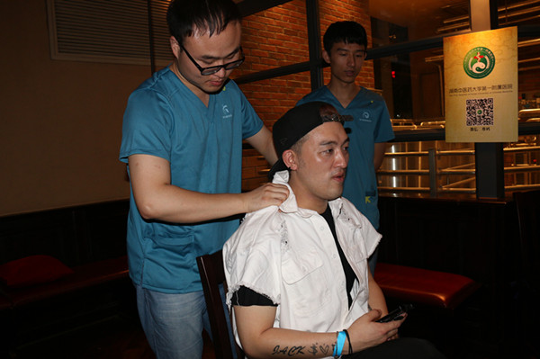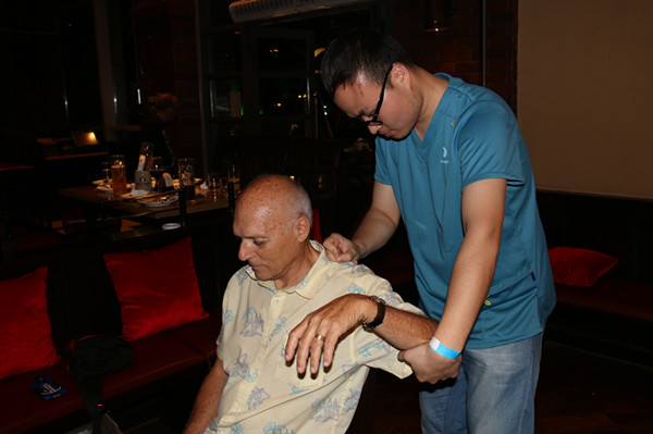在派对现场,附一院针灸推拿科还派出两名专业推拿医师,为外国友人提供推拿服务。一位73岁的美国老人颈背肌肉严重劳损,附一推拿医师利用“一指禅推”法、滚法等中医传统手法放松其颈肩部劳损肌肉,使局部肌肉得到松解,血液循环得到改善,舒解疲劳和疼痛。