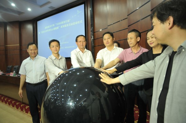 刘后红宣布湖南省2017年“12355阳光行动”暨“关注大中专学生心理健康”系列服务活动正式启动。启动仪式结束后,李志超、刘后红灯相关领导参观我校大学生心理健康教育中心,并为省第二人民医院设在我校的远程心理咨询服务点揭牌。