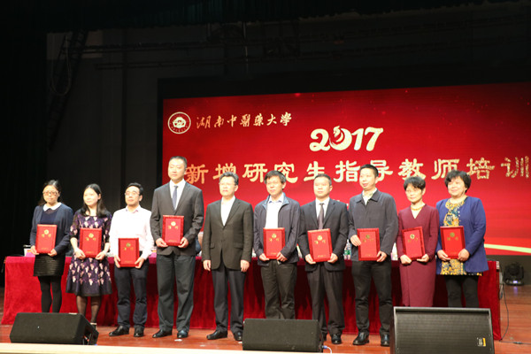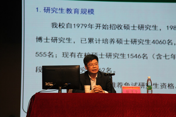 彭清华致辞,他向省学位办等单位对本次导师培训给予的关心和支持表达诚挚的谢意,并将此次导师遴选各个环节做了具体汇报。彭清华在8日下午作了题为“中医药研究生教育的思考”的讲座,从我校研究生教育的历史、中医药研究生教育发展趋势和存在的问题、我校研究生教育理念、发展目标及规划、正确把握导师定位、加强导师的管理、研究生教育管理工作思路共7个方面对研究生教育情况做了简要介绍,并对新增的博士、硕士研究生导师提出了新的要求。