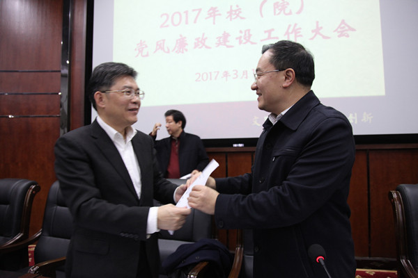 3月15日下午,2017年校(院)党风廉政建设工作大会在国际交流中心学术报告厅召开,会议的主要任务是:全面贯彻党的十八届六中全会、中纪委十八届七次全会和习近平总书记系列重要讲话精神,认真落实省纪委十一届二次全会和全省教育系统党风廉政建设和反腐败工作视频会议工作部署,总结校(院)2016年纪检监察工作,部署2017年党风廉政建设和反腐败工作任务。全体在家校(院)领导,校(院)纪委委员、副处级以上干部,各民主党派主要负责人、专职纪检干部参加了会议,会议由校(院)党委副书记、大学校长秦裕辉主持。