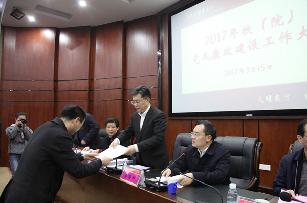 秦裕辉等校(院)领导班子成员现场签订并递交了2017年党风廉政建设责任书