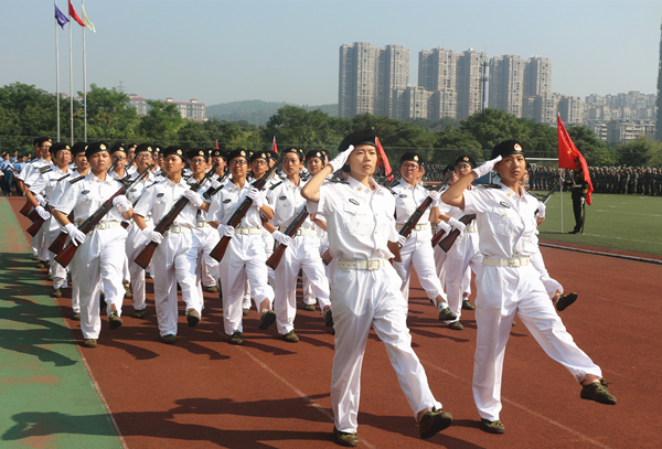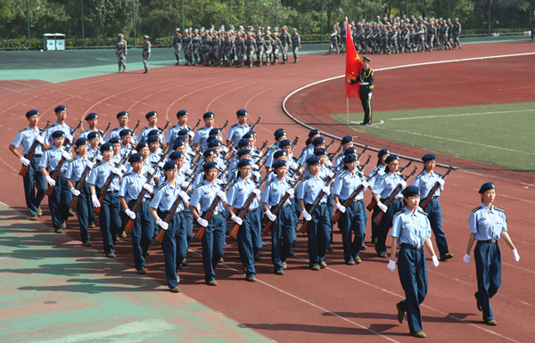 总教官艾书周上校指挥新生军训分列式表演。初秋的含浦校区蓝天高远,白云卷舒,丽阳明媚,金风飒爽,雄壮的音乐中,旗帜飘扬,10个军训营旗手踏步入场,标兵入场,一一就位,大学军训团团旗护卫组、陆军持枪方队、海军持枪方队、空军持枪方队、27支学生分列式方队等,军姿崭齐,队列工整,步伐有力,经过检阅台,严明的纪律风范,饱满的精神气质,勃发的青春气息,完美呈现了崭新杏林学子的良好面貌,也为“大学第一课”——军训,集体交上了一份优异答卷。