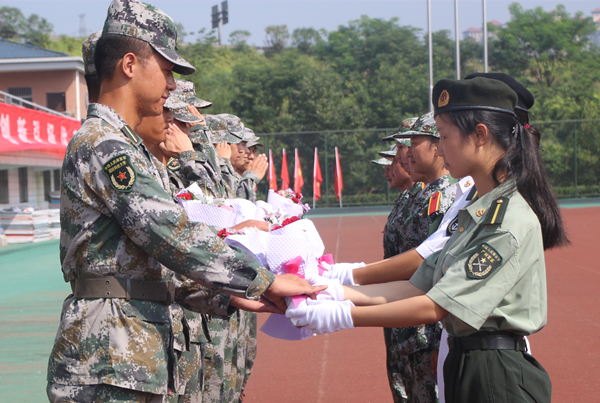 校(院)党委副书记肖小芹宣读军训表彰决定。学生代表现场向优秀教官献花。在军训领导小组的指导下,在全体军训教官、师生共同努力下,我校2016级学生军训任务圆满完成,军训活动中涌现出了一批先进集体和先进个人。为鼓励先进、树立榜样,经研究,授予一营1号方队等10个方队“优秀方队” 荣誉称号;授予樊晶晶等115名同学“军训标兵”荣誉称号;授予乔建伟等10名教官“优秀教官”荣誉称号。