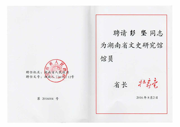 此次聘任的省文史研究馆馆员还有凌宇(湖南师范大学文学院原院长、教授、博导),王宏(省国资委党委原副书记、纪委书记、一级美术师、中国书协会员、省书协副主席),杨虹(湖南商学院原副院长、二级教授)等,彭坚教授系中医药界唯一代表。