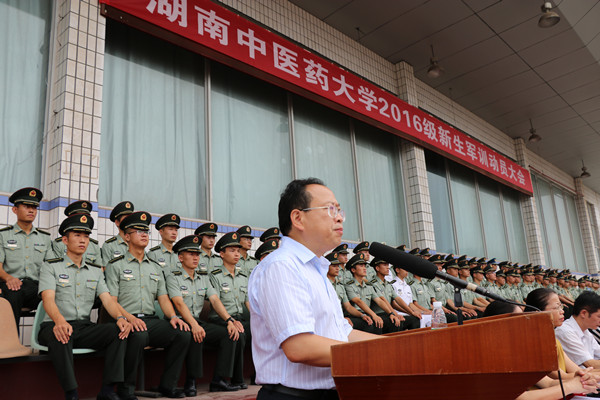 武装部部长、军训团团长姚旭东宣读相关军训文件。新生代表、护理学院2016级护理五班罗育媛同学承诺将严格要求自己,团结互助同学,尊重服从教官,以饱满的热情、坚定的意志刻苦训练。