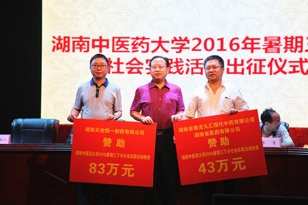 7月4日上午,我校大学生暑期“三下乡”社会实践活动出征仪式在含浦校区学生活动中心举行。副校长葛金文,湖南天地恒一制药有限公司常务副总经理宋至林、湖南春光九汇现代中药有限公司总经理唐正平,以及学校组织人事部、党委宣传统战部、学生工作处、校团委等相关职能部门和二级学院负责人,各学院学生科科长、分团委书记及三下乡指导老师、学生志愿者等参加仪式。