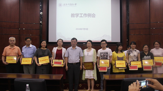 会议宣布了2016年度青年教师课堂教学竞赛获奖选手名单,传达了《湖南中医药大学关于表彰优秀临床课程教研室的决定》及《关于表彰2015-2016学年度非直属附属医院系列教学工作的决定》两份文件精神。何清湖向获奖个人及受表彰单位代表颁发奖励证书及奖金。