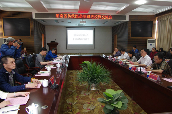 湖南省文化厅非物质文化遗产处处长陈友材,湖南省中医药管理局副局长毛泽禾,我校副校长、湖南中医药文化研究基地首席专家何清湖,湖南省内共10家传统医药类省级非物质文化遗产项目代表以及我校图书馆、党委宣传部统战部、人文社科学院、中医药文化研究基地、中医文化研究室等相关负责人参加会议。会议由何清湖主持。湖南卫视、湖南经视、湖南导视频道、湖南日报等多家媒体参与报道了此次非遗进校园交流会。