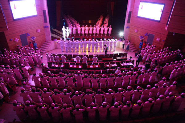 在授帽仪式这一重要时刻,护理前辈们为护理学子戴上圣洁的洁白燕帽,护理学子接过前辈手中的煦红烛光,右手握拳高举,集体宣读神圣誓言:“我宣誓:以救死扶伤、防病治病,实行社会主义的人道主义,全心全意为人民服务为宗旨,履行护士的天职;我宣誓:以自己的真心、爱心、责任心对待我所护理的每一位病人;我宣誓:我将牢记今天的决心和誓言,接过前辈手中的蜡烛,把毕生经历奉献给护理事业。”坚定的誓言与不灭的烛光,汇聚成爱的海洋,彰显、传达出护理学子对南丁格尔精神的继承,对护理事业之火的传递,对生命的责任与担当。