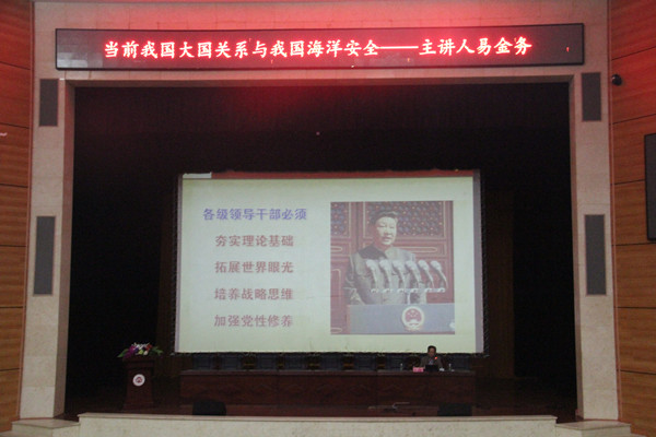 开班典礼结束后,易金务教授作了题为《当前大国关系与我国海洋安全》的讲座,他主要围绕大国关系是影响我国周边安全的主要因素、海洋争端是我国当前周边安全的焦点问题、三大战略是维护我国周边安全的保障三方面内容进行了阐述。