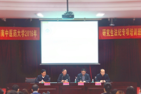 3月23日,研究生院组织了对我校研究生的法纪专项培训活动,特邀大学纪委书记肖小芹、党委宣传统战部部长宋翠平、保卫处处长姚旭东、校法律顾问刘大华、研究生院院长阳仁达等,对2014级硕士研究生、2010级七年制学生、全体党员干部、班干部、研究生会干部共计600余人进行了培训,旨在通过学法纪,让广大研究生慎言行、笃学问、明事理,成长为高素质的中医药事业接班人和现代公民。