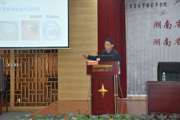 会议共收到参会代表的论文40余篇,6位专家在会上作了专题报告。廖端芳教授报告了烟酸姜黄素酯调节荷脂细胞胆固醇跨膜转运的分子机制,邓常清教授报告了凝血因子XI(FXI)为靶点抗栓进展及对血瘀证及活血化瘀药物研究的思考,伍参荣教授报告了中药七味白术散抗HRV感染的研究进展,成绍武教授报告了精准医学及其对中医药发展的机遇与挑战,湘雅医学院李雄教授报告了癌症研究新进展及中医药研究的思考,涂鄂文主任医生报告了急性缺血性脑卒中溶栓流程.