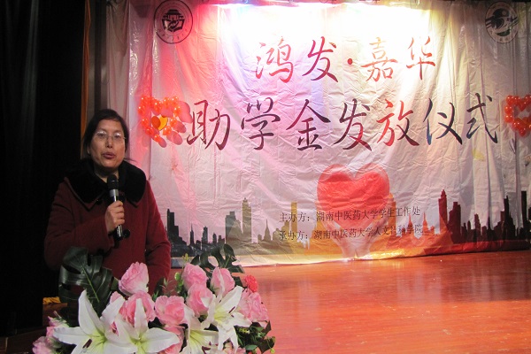 肖小芹为本次晚会开幕致辞,表达了对嘉华美瑞影院股份有限公司慷慨资助的感谢,并寄予了对我校接受助学金的同学们的殷切期望。