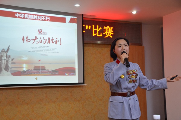 比赛现场,参赛选手们倾情演绎着一个个感人至深、催人奋进的红色经典故事,她们生动的语言,形象的表演,激昂或温情的音乐无不温暖感染感动着现场的每一位观众。骨伤支部的陈灵兰带来的《伟大的胜利,不朽的精神》不仅讲述的是自己爷爷当红军时的亲身经历,更是在服装上让人耳目一新,军装上佩戴着那一枚枚真实的金色勋章是她爷爷当年英勇作战、奋勇杀敌的历史见证,仿佛让观众置身于那个红色的年代,一起感受抗战胜利70周年的喜悦。机关支部张晶晶带来的《一生守望的生死之爱》,真情诉说着一位苏区红军高级将领的遗孀池煜华执著地认定丈夫仍活在世上,用一生独饮那份孤独,用一生坚守那份爱情,在守望中送走了最美好的年华。循着老歌的声音,重温曾经的岁月,聆听一段段熟悉或陌生的故事,比赛现场气氛温馨热烈,掌声雷动。